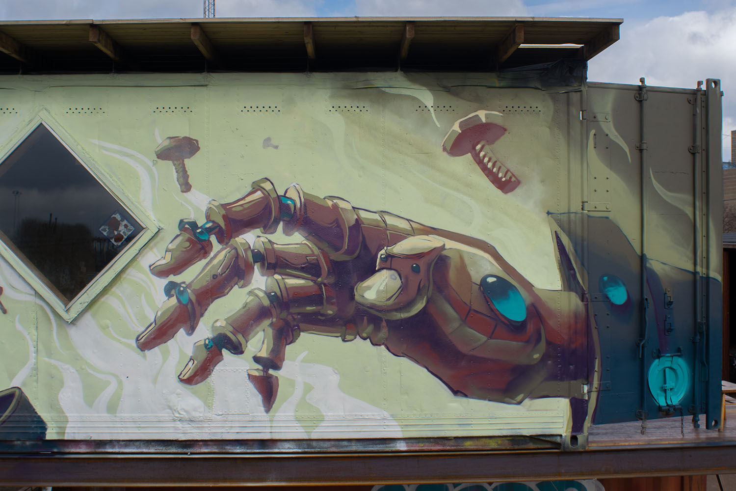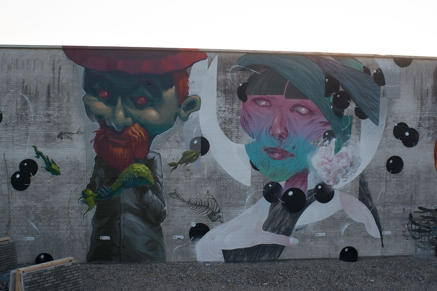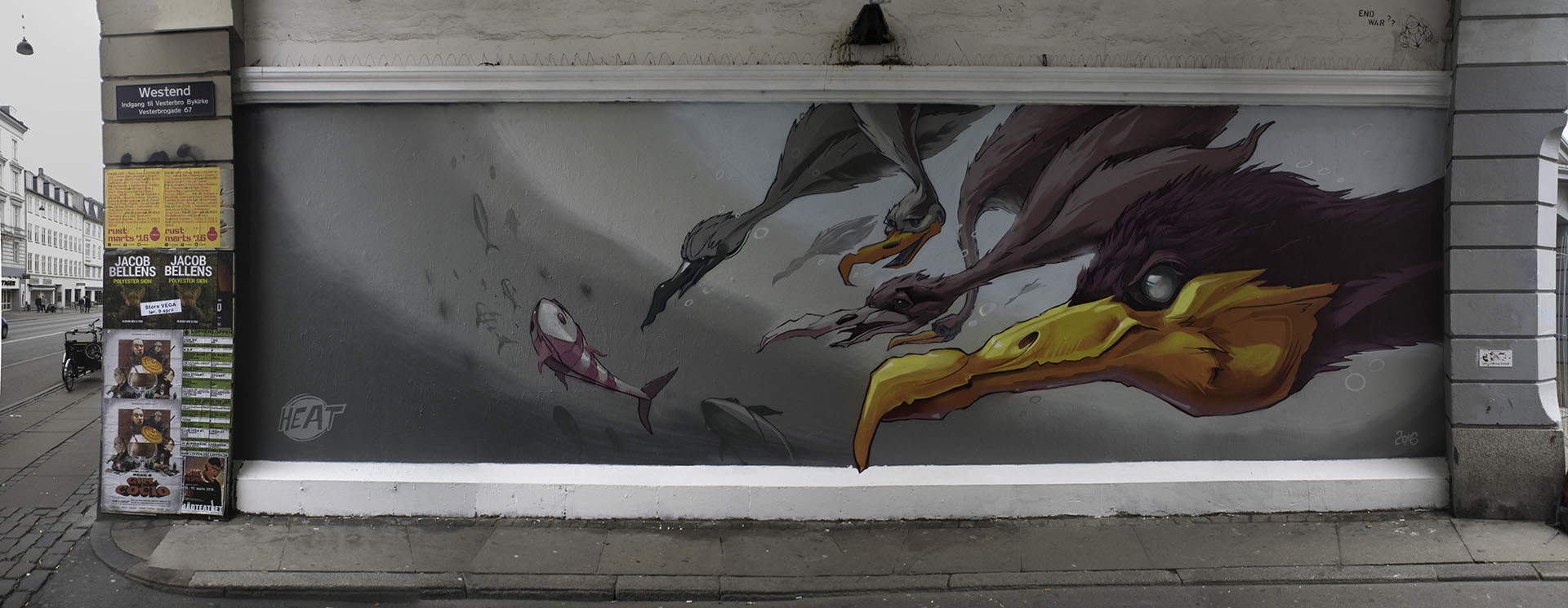 While already in Copenhagen Fat Heat collaborated with the organizers of the Westend Walls Crew, who are organizing a constantly changing outside gallery in Copenhagen. He also collaborated on a sci-fi themed wall with the legendary Storm HA.